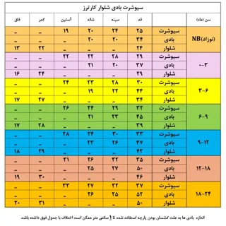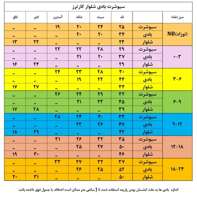 یه جدول اندازه داره که تو اسلایدای عکس هست حتما ببینید و پایین هم سایزی که خود برند کارترز گفته رو هم براتون زدیم